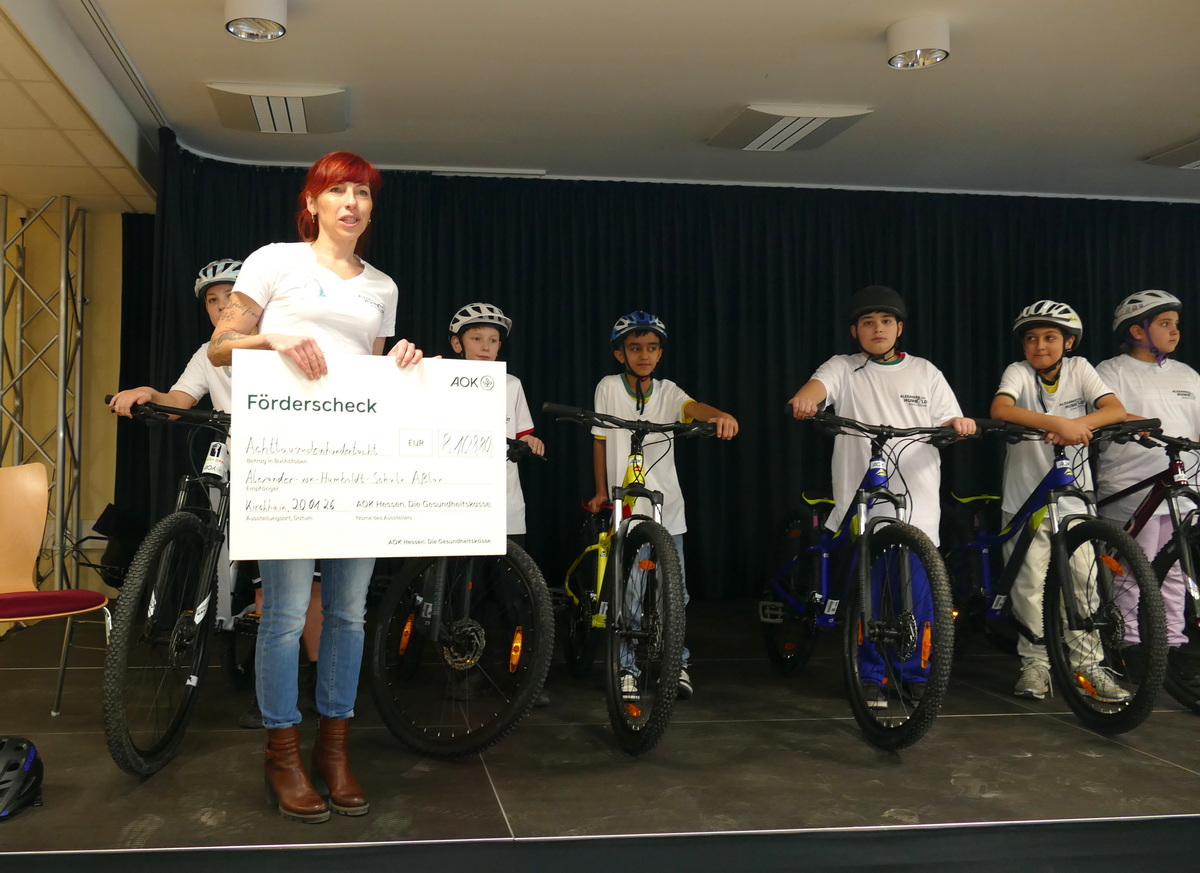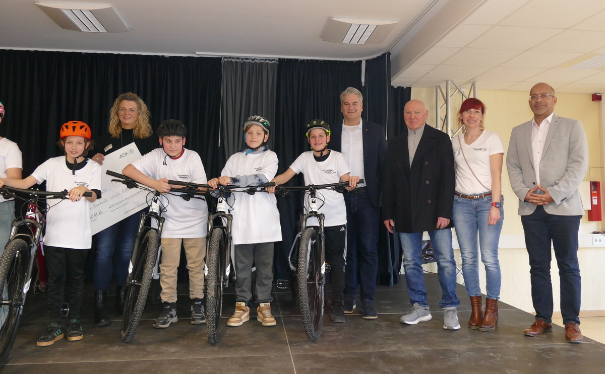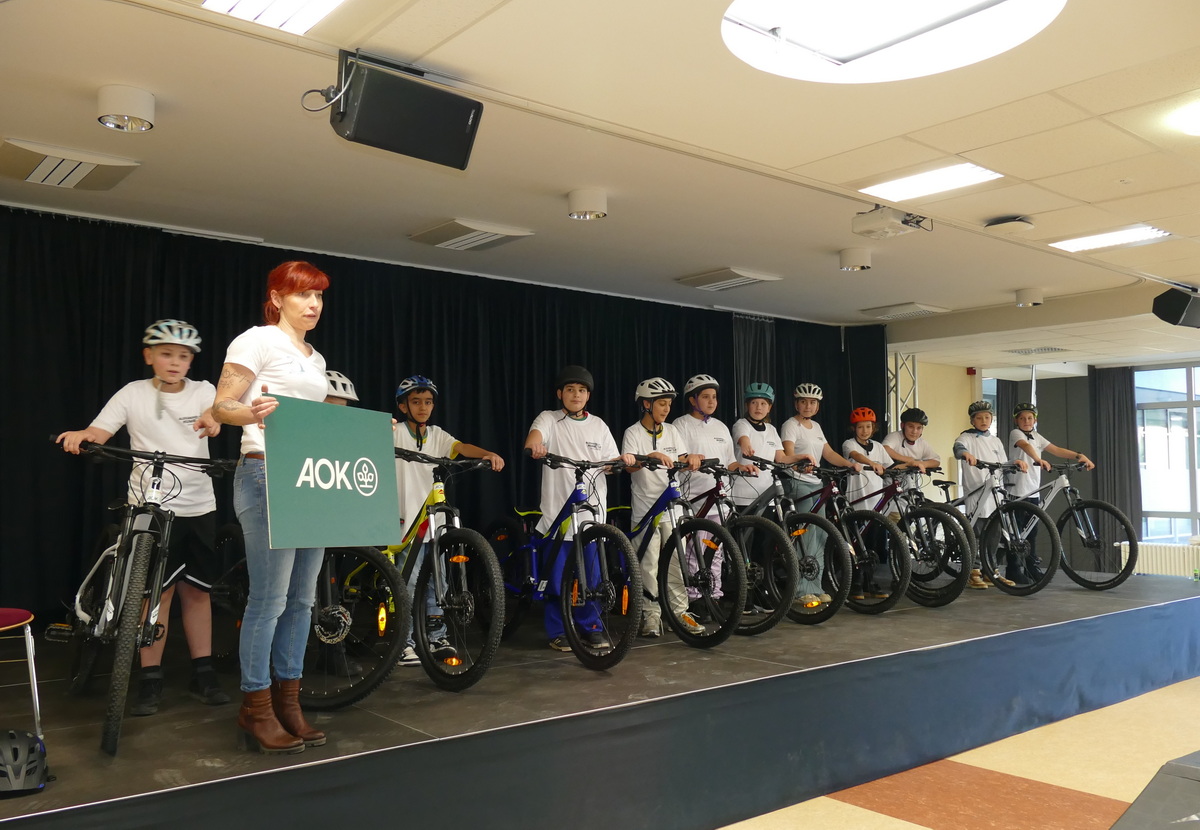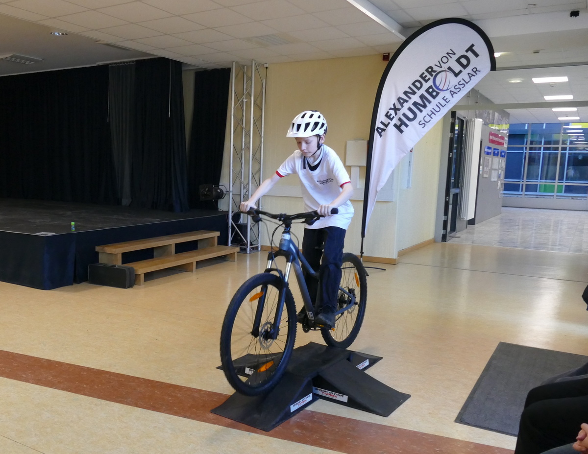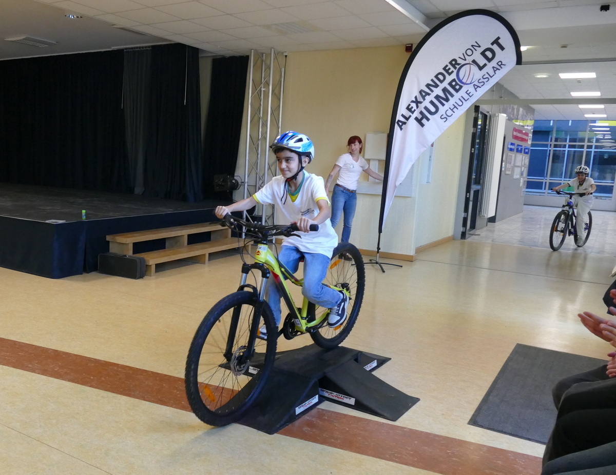 Seit Schuljahresbeginn sieht man auf dem Gelände der Alexander-von-Humboldt-Schule Aßlar während der Unterrichtszeit regelmäßig Fünftklässler auf Mountainbikes unter Anleitung von zwei Lehrkräften ihre Runden drehen. Meist gilt es, mit dem Zweirad einen Parcours zu durchfahren oder Geschicklichkeitsübungen zu machen. Nutzten die Schüler zunächst noch ihre privaten Bikes, ergaben sich dank des Prädikats „Bikeschool“, dessen Kriterien die Schule schon seit einiger Zeit erfüllt, nun neue Möglichkeiten: Mithilfe der finanziellen Unterstützung durch die „Allgemeine Ortskrankenkasse“ (AOK) konnten 14 hochwertige Mountainbikes angeschafft werden. Im Sportunterricht, bei dem sich die Fünftklässler in Zyklen mit Schwimmen und Fahrradfahren abwechseln, sowie in einer Mountainbike-AG lernen die Schüler nicht nur sicher Fahrrad fahren, sondern auch Verantwortung für das Material zu übernehmen und kleinere Reparaturen selbständig durchzuführen.
