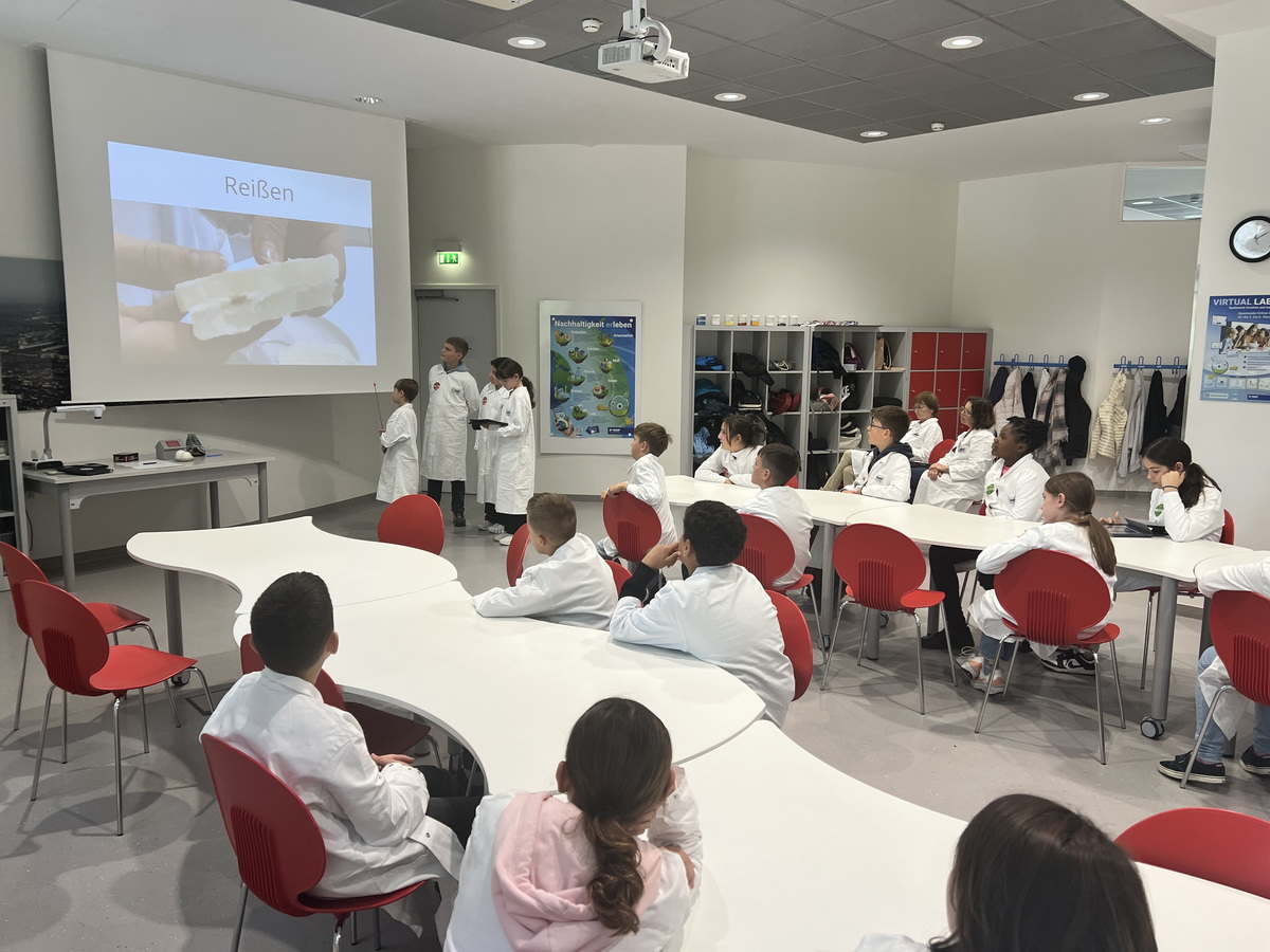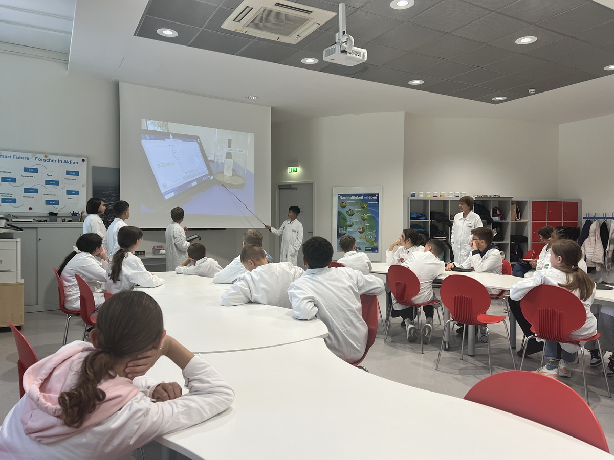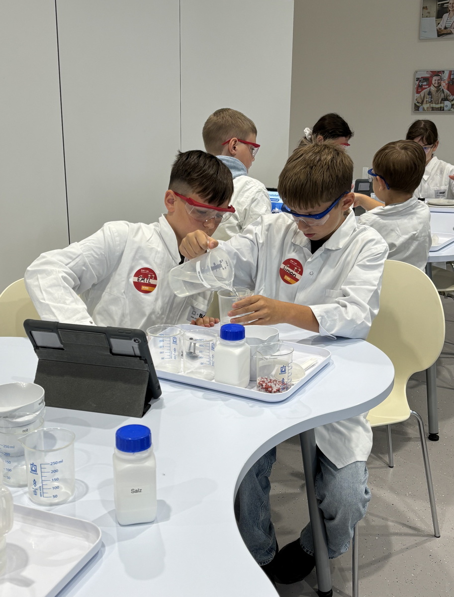So haben sich 28 Fünft- und Sechstklässler, begleitet von Elisa Rehm und Stufenleiter Asmus Sprzagala, im BASF Kids‘ Lab in Ludwigshafen einen Tag lang als Forscher betätigt. In Gruppen durften sie selbstständig experimentieren und setzten sich so mit aktuellen Themen der Chemie auseinander, wobei auch digitale Technik zum Einsatz kam. Unter der Überschrift „Smart Future“ führten sie Versuche zu relevanten Themen wie „Schaum- bzw. Kunststoff-Recycling“, „CO2“ und „Schwämme“ durch.