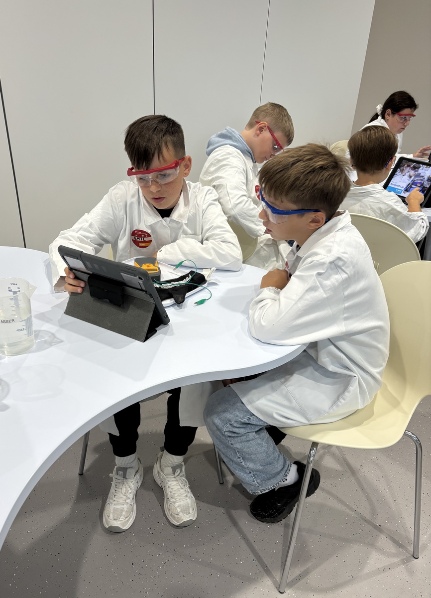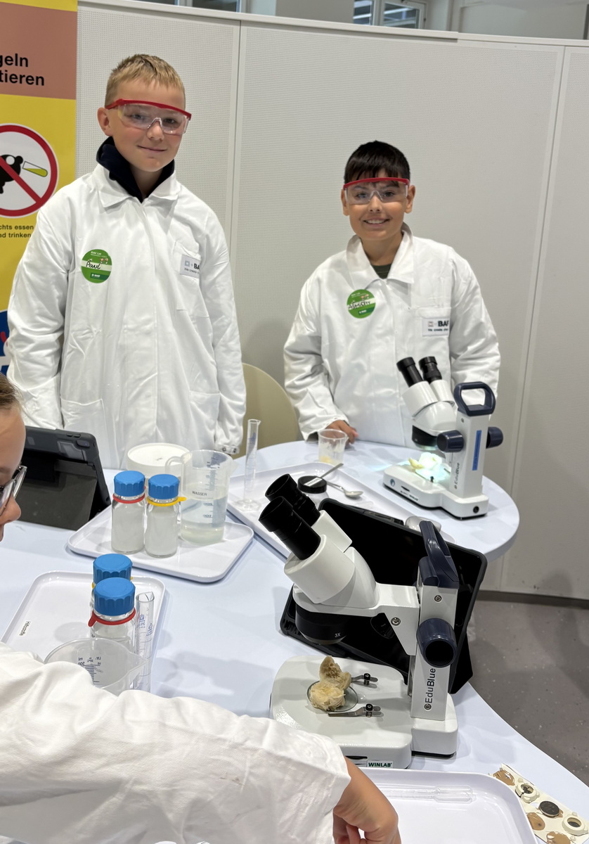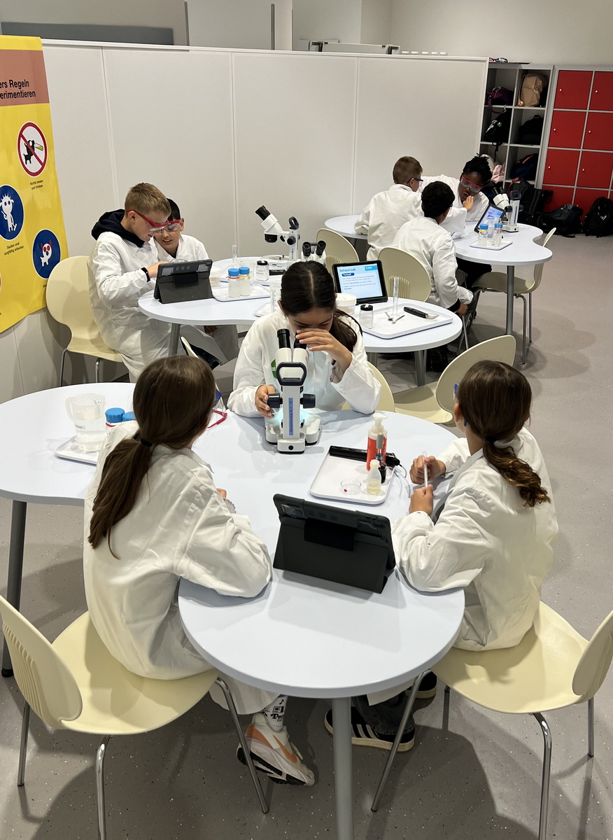 So haben sich 28 Fünft- und Sechstklässler, begleitet von Elisa Rehm und Stufenleiter Asmus Sprzagala, im BASF Kids‘ Lab in Ludwigshafen einen Tag lang als Forscher betätigt. In Gruppen durften sie selbstständig experimentieren und setzten sich so mit aktuellen Themen der Chemie auseinander, wobei auch digitale Technik zum Einsatz kam. Unter der Überschrift „Smart Future“ führten sie Versuche zu relevanten Themen wie „Schaum- bzw. Kunststoff-Recycling“, „CO2“ und „Schwämme“ durch.