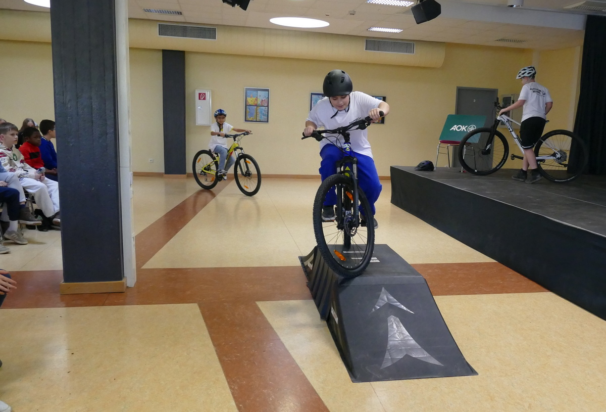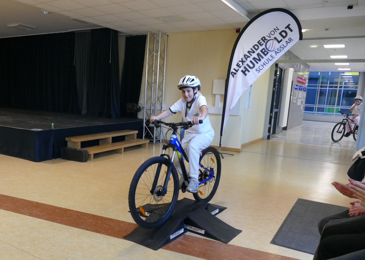 Seit Schuljahresbeginn sieht man auf dem Gelände der Alexander-von-Humboldt-Schule Aßlar während der Unterrichtszeit regelmäßig Fünftklässler auf Mountainbikes unter Anleitung von zwei Lehrkräften ihre Runden drehen. Meist gilt es, mit dem Zweirad einen Parcours zu durchfahren oder Geschicklichkeitsübungen zu machen. Nutzten die Schüler zunächst noch ihre privaten Bikes, ergaben sich dank des Prädikats „Bikeschool“, dessen Kriterien die Schule schon seit einiger Zeit erfüllt, nun neue Möglichkeiten: Mithilfe der finanziellen Unterstützung durch die „Allgemeine Ortskrankenkasse“ (AOK) konnten 14 hochwertige Mountainbikes angeschafft werden. Im Sportunterricht, bei dem sich die Fünftklässler in Zyklen mit Schwimmen und Fahrradfahren abwechseln, sowie in einer Mountainbike-AG lernen die Schüler nicht nur sicher Fahrrad fahren, sondern auch Verantwortung für das Material zu übernehmen und kleinere Reparaturen selbständig durchzuführen.