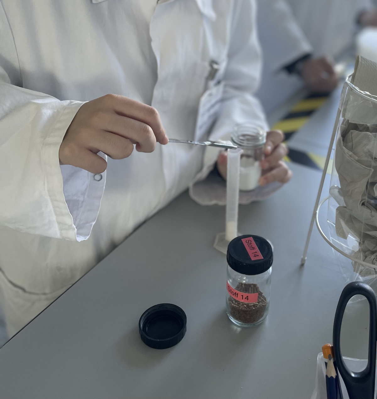 Nach einer Sicherheitseinweisung erhielten die Schüler, die in Gruppen arbeiteten, jeweils 16 Stoffe, die sie mit verschiedenen Verfahren identifizieren mussten. So untersuchten sie u.a. das Lösungsverhalten, das Gärvermögen, die Schüttdichte, den PH-Wert und die Flammverfärbung.