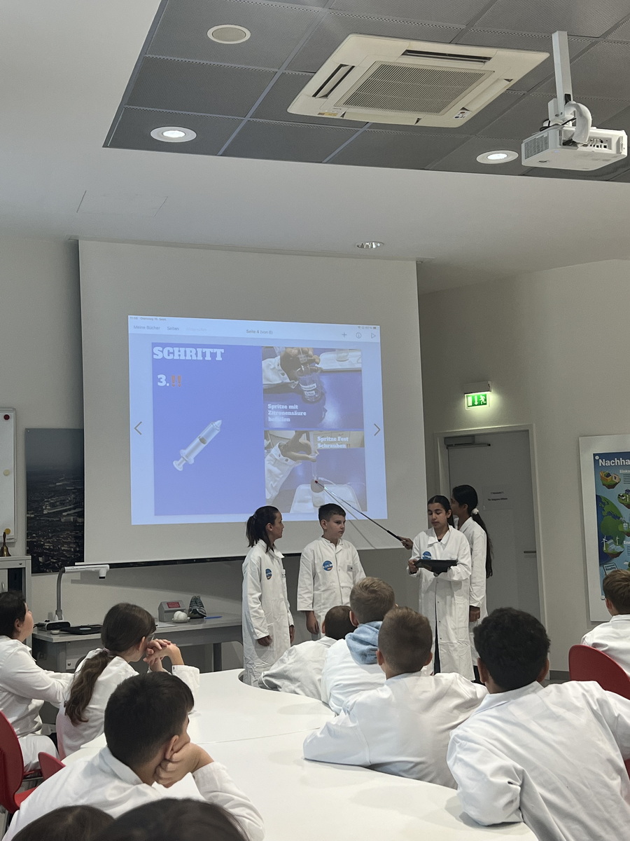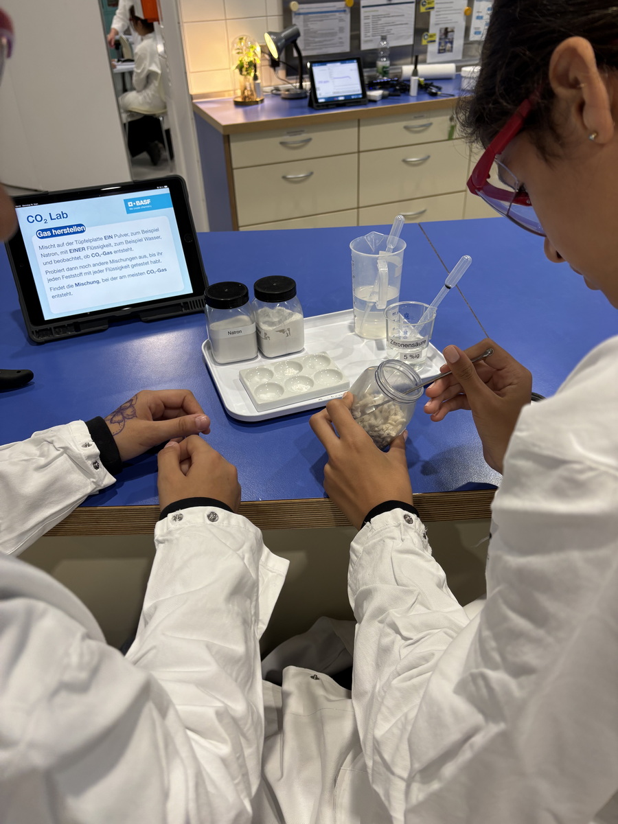 So haben sich 28 Fünft- und Sechstklässler, begleitet von Elisa Rehm und Stufenleiter Asmus Sprzagala, im BASF Kids‘ Lab in Ludwigshafen einen Tag lang als Forscher betätigt. In Gruppen durften sie selbstständig experimentieren und setzten sich so mit aktuellen Themen der Chemie auseinander, wobei auch digitale Technik zum Einsatz kam. Unter der Überschrift „Smart Future“ führten sie Versuche zu relevanten Themen wie „Schaum- bzw. Kunststoff-Recycling“, „CO2“ und „Schwämme“ durch.
